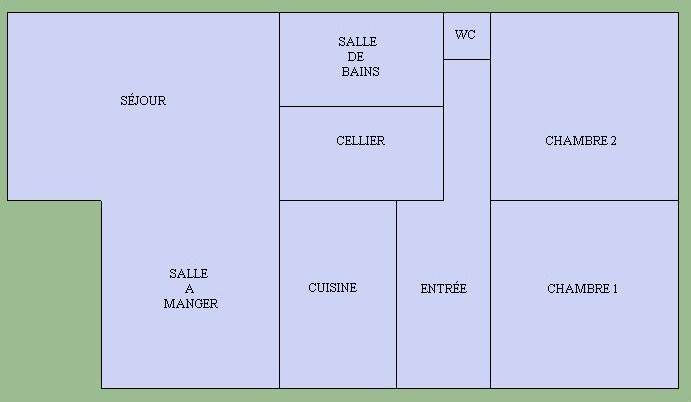 Hall d'entrée, cuisine aménagée, cellier, double séjour de 52 m² avec cheminée, deux grandes chambres, salle de bains et WC séparé.