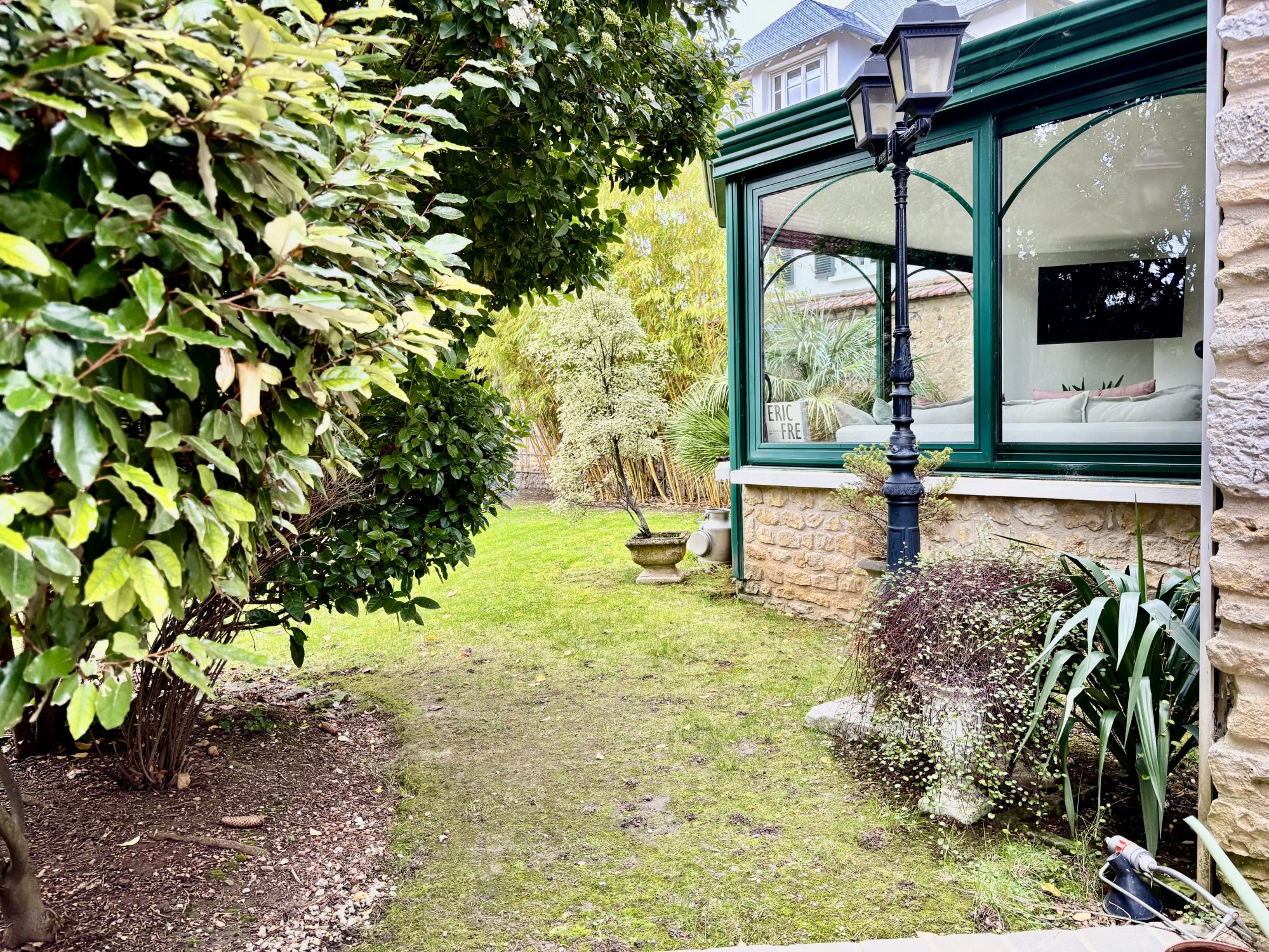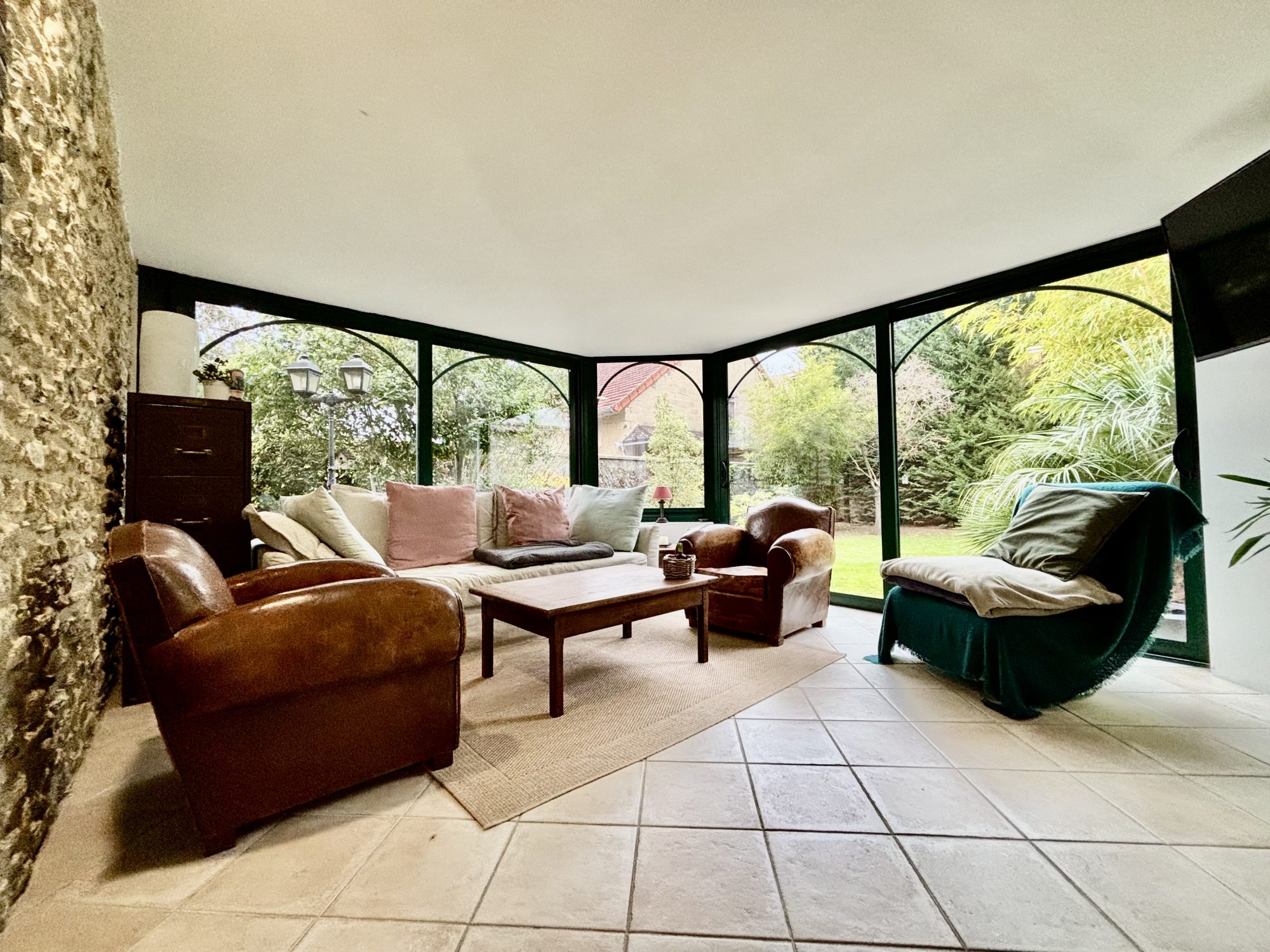 Une entrée donnant sur une belle pièce de vie, en prolongement une véranda avec vue sur le jardin, une cuisine entièrement aménagée et équipée, une chambre, une salle de bains, et un WC indépendant.