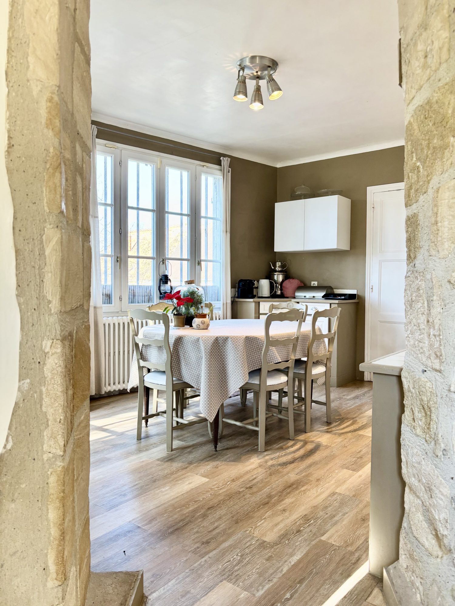 - au rez-de-chaussée : une cuisine, une grande pièce de vie avec une hauteur sous plafond de 3,45 m avec cheminée, une véranda, un wc avec lave main, une buanderie, une chaufferie et une cave à vin.